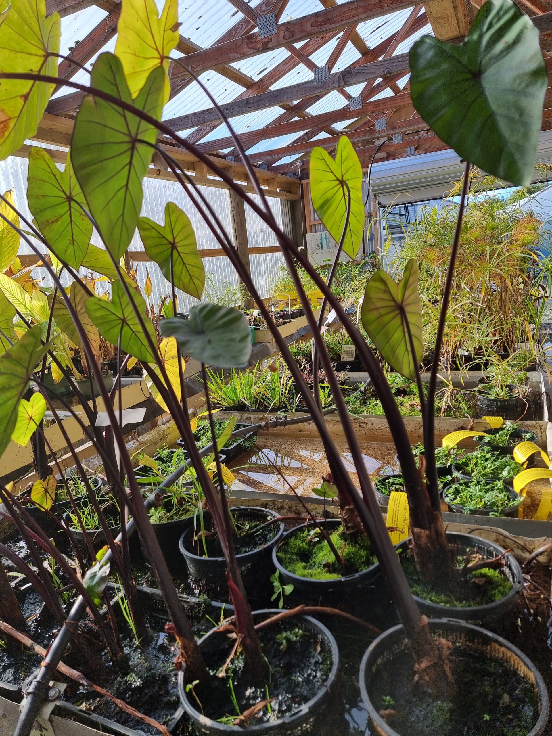 Black Taro has leaves and petioles that are very dark green and purple.