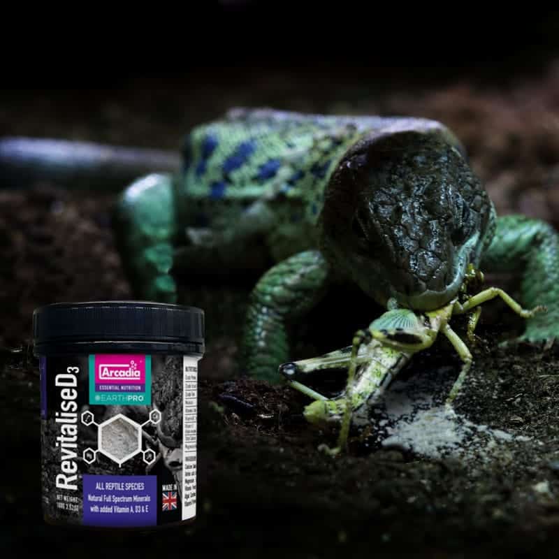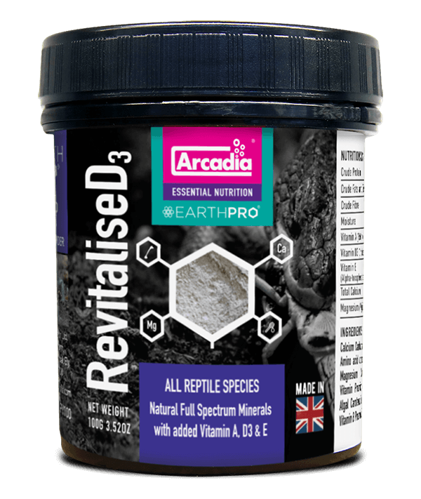 EarthPro-RevitaliseD3 is the result of years of research and development. By working with Vets and Reptile care experts around the world Arcadia have developed a brand new ultra-fine powder that can be used to help top up levels of preformed vitamins A, D3 and E whilst still supplying the very best of the balance of natural Earth Minerals, Amino Acids, Full-Spectrum carotenoids and Bee Pollen.