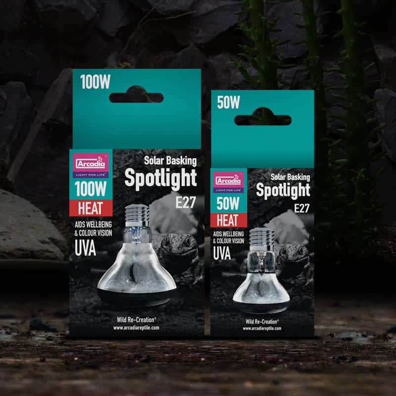 Available in 75w, 100w and 150w intensities, these Arcadia Basking Solar Lamps create and intense spot of high UVA and Infra-Red rays to light up and heat up your reptile when they need to increase their body temperature. As well as helping to increase the ambient temperature in your vivarium or terrarium, you will often find your reptile basking under its’ warm glow.