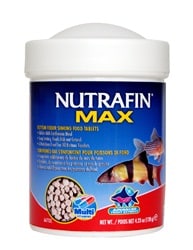 Nutrafin Max Bottom Feeder Sinking Food Tablets, with Earthworm Meal, is a highly palatable formula that provides nutrition to bottom feeders in their natural area. The tablets sink to the bottom of the aquarium to provide excellent nutrition to bottom feeders. Naturally coloured by its ingredients, the fish food also contains multi-vitamins, natural colour enhancers, and Advanced Yeast Extract, which helps improve digestion and allows optimal nutrient absorption 60g INGREDIENTS: Fish meal, fish protein concentrate, wheat flour, corn meal, oatmeal, earthworm meal, wheat gluten meal, soy protein concentrate, squid meal, shrimp meal, fish liver meal, soybean flour, dried yeast, salmon oil (ethoxyquin used as preservative), squid liver meal, dried kelp, hydrolyzed soy protein, vitamins (cholecalciferol, biotin, d-calcium pantothenate, folic acid, inositol, niacin supplement, riboflavin-5-phosphate, calcium L-ascorbyl-2-monophosphate, vitamin A acetate, thiamine hydrochloride, vitamin B12 supplement, pyridoxine hydrochloride, vitamin E supplement, menadione sodium bisulfite complex (source of vitamin K activity)), yeast extract, fructooligosaccharide, lecithin. GUARANTEED ANALYSIS: Crude protein Min. 45.5%; Crude fat Min. 5%; Crude fibre Max. 1%; Moisture Max. 7%; Ash Max. 10.5%; Phosphorus Min. 0.7%, Vitamin A Min. 15,500 IU/lb; Ascorbic Acid (Vitamin C) Min. 350 mg/lb; Vitamin E Min. 100 IU/lb