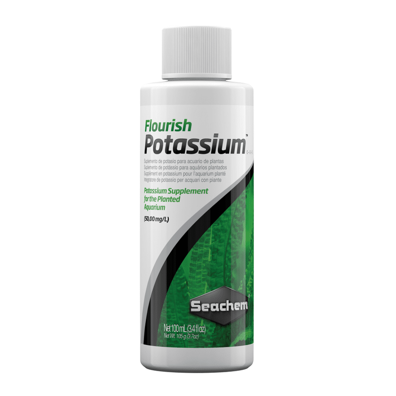 Flourish Potassium contains 50,000 mg/L of potassium suitable for the natural planted aquarium. Potassium is one of several elements that are vitally important to maintaining a vigorous level of growth in a planted aquarium. Potassium can become depleted in a rapidly growing system or when the source water has a low mineral content. In these cases potassium could become the limiting factor to growth. Use Flourish Potassium to prevent potassium depletion (signs of which include yellowing in older leaves) and maintain the highest level of growth.