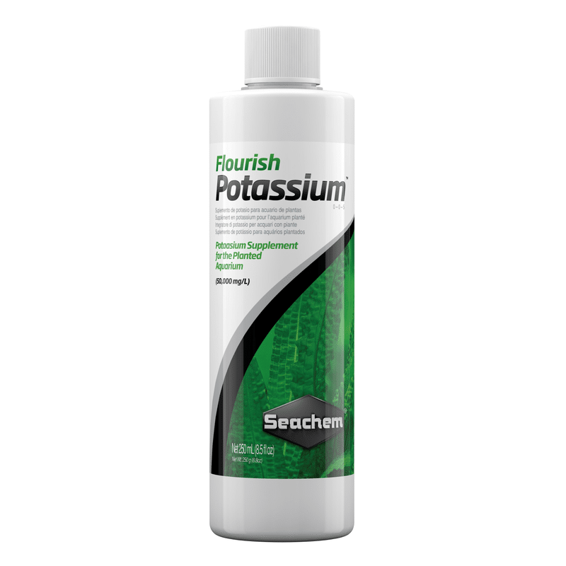 Flourish Potassium contains 50,000 mg/L of potassium suitable for the natural planted aquarium. Potassium is one of several elements that are vitally important to maintaining a vigorous level of growth in a planted aquarium. Potassium can become depleted in a rapidly growing system or when the source water has a low mineral content. In these cases potassium could become the limiting factor to growth. Use Flourish Potassium to prevent potassium depletion (signs of which include yellowing in older leaves) and maintain the highest level of growth.