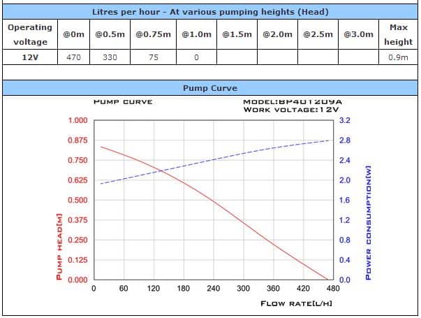 The SP 5 has a flow rate of 470 litres per hour with a lift height maximum of 90 cms. (Output per hour reduces with height)